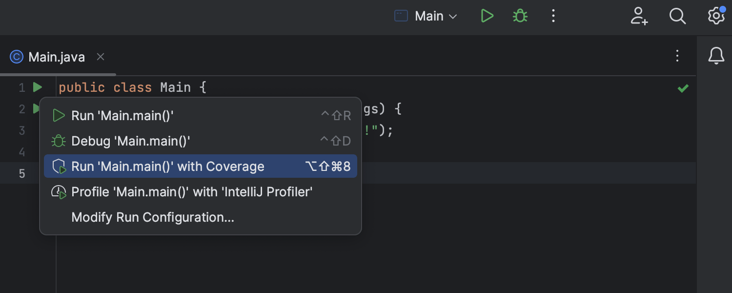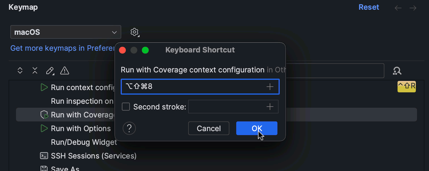 在 IntelliJ IDEA 2023.1 中,可以为当前打开的文件创建快捷键启动 Run with coverage(使用覆盖率运行)操作,即使尚未创建运行配置。 要指定此类快捷键,首先转到 Settings/Preferences | Keymap(设置/偏好设置 | 按键映射),查找 Run with Coverage context configuration(使用覆盖率上下文配置运行)选项,然后为其添加新的组合键。