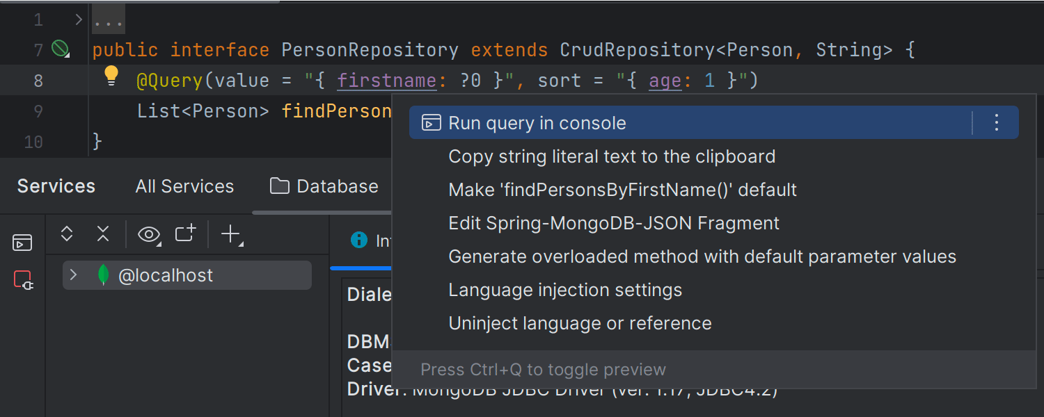 IntelliJ IDEA Ultimate 2023.1 可以从 Spring 和 Micronaut Data 仓库在 Database(数据库)控制台中运行 MongoDB 查询。 在查询字符串中使用新的 Run query in console(在控制台中运行查询)意图操作即可。 IDE 将生成对应的 JavaScript 调用,包括额外的请求形参,例如 sort。