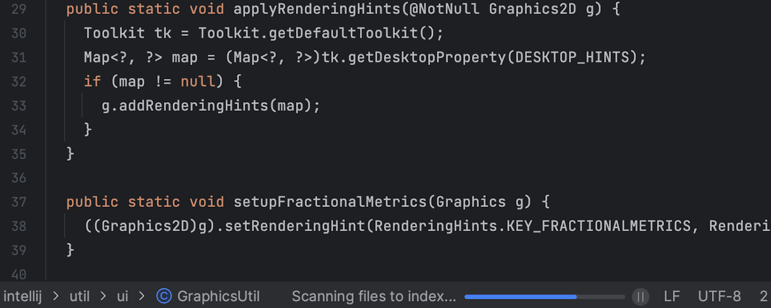我们通过在智能模式下执行 Scanning files to index(正在扫描要建立索引的文件)进程改进了 IDE 启动体验。 这样可以在启动过程中更早地提供完整的 IDE 功能。 打开项目时,IntelliJ IDEA 2023.1 会使用项目先前会话中的现有缓存,并同时查找要建立索引的文件。 如果在扫描中没有发现更改,IDE 将准备就绪,消除此前启动时建立索引所造成的延迟。