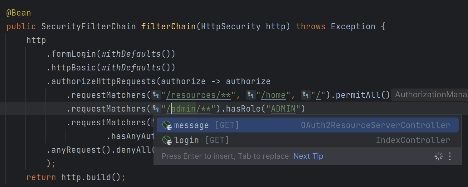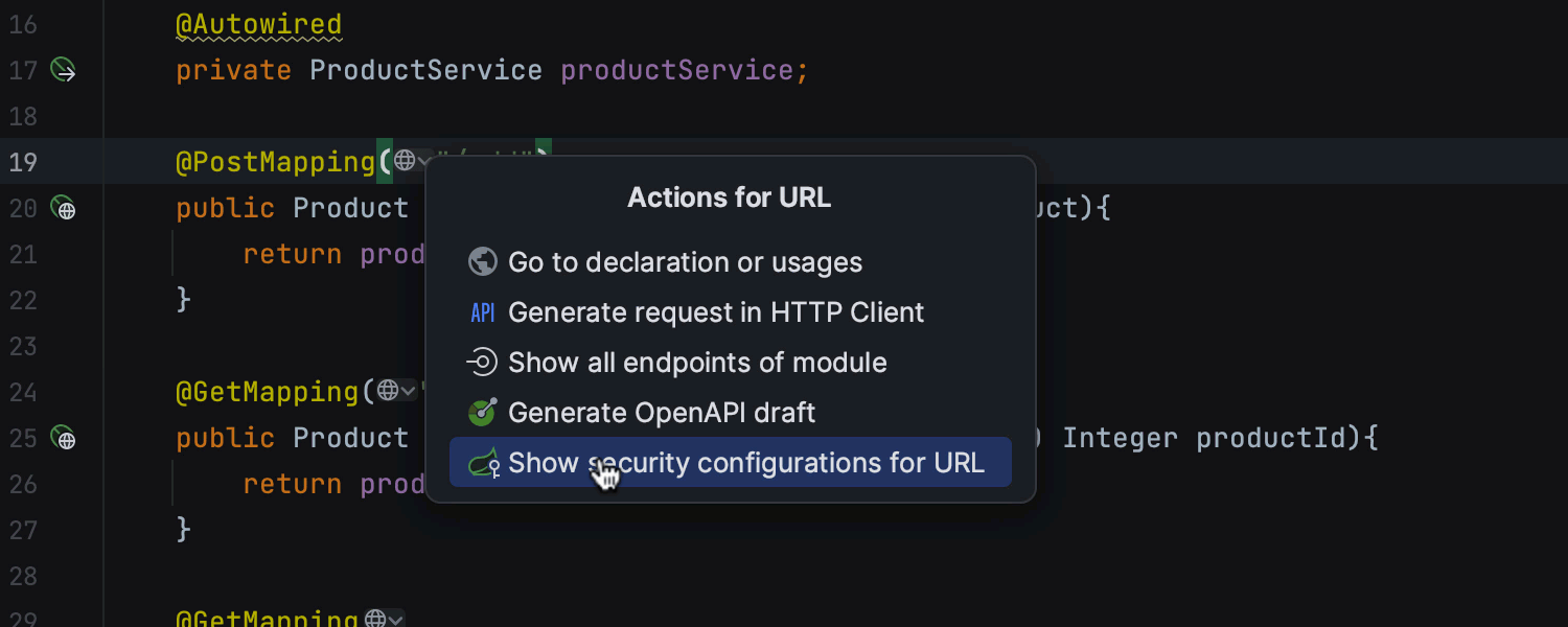 为了使应用的安全规则更易查看,IntelliJ IDEA Ultimate 2023.1 提供了从 Spring 控制器到安全匹配器的轻松导航。 导航可在安全匹配器和控制器之间双向进行。