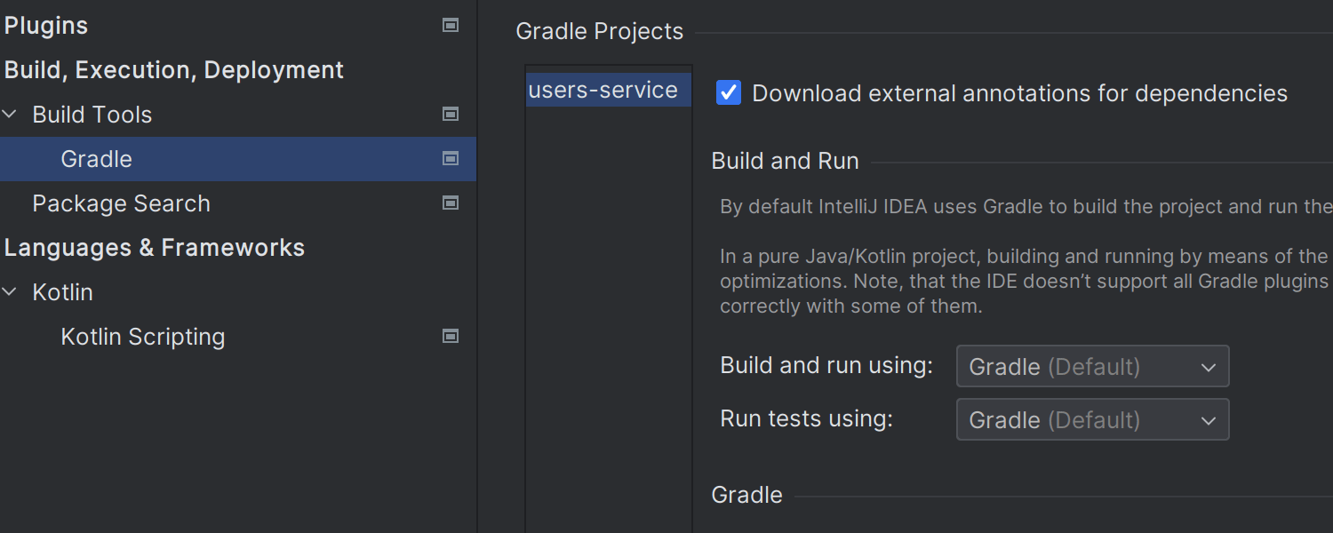 在 Spring 运行配置中,Gradle 现在是运行和构建项目的默认选项。 IDE 现在使用 Settings/Preferences | Build, Execution, Deployment | Build Tools | Gradle(设置/偏好设置 | 构建、执行、部署 | 构建工具 | Gradle)中定义的 Gradle 以主设置构建和运行项目。