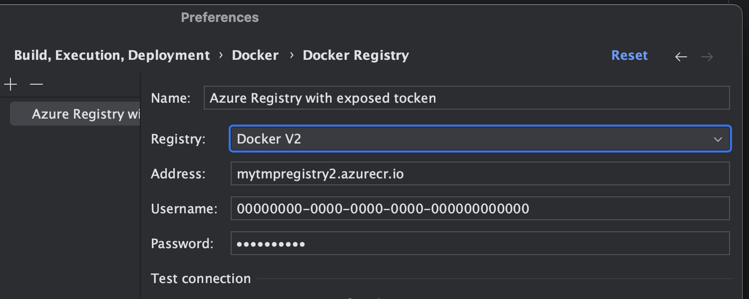 您现在可以轻松连接到 Azure 容器注册表。 转到 Settings/Preferences | Build, Execution, Deployment | Docker | Docker Registry(设置/偏好设置 | 构建、执行、部署 | Docker | Docker 注册表),在 Registry(注册表)输入字段中选择 Docker V2 进行设置。
