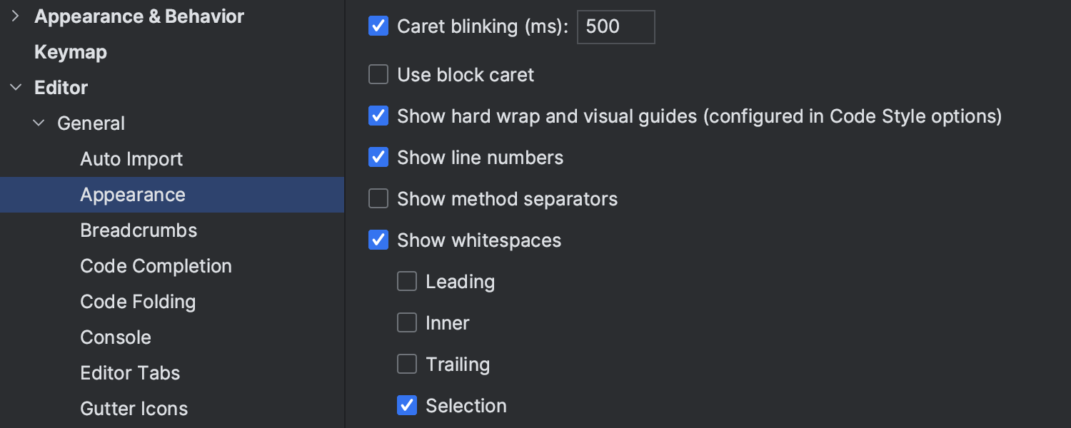 IntelliJ IDEA 2023.1 在 Settings/Preferences | Editor | General | Appearance | Show Whitespaces(设置/偏好设置 | 编辑器 | 常规 | 外观 | 显示空格)中提供了一个新的 Selection(选区)复选框,允许您配置此设置,让 IDE 仅在选择代码时将空格显示为小点。