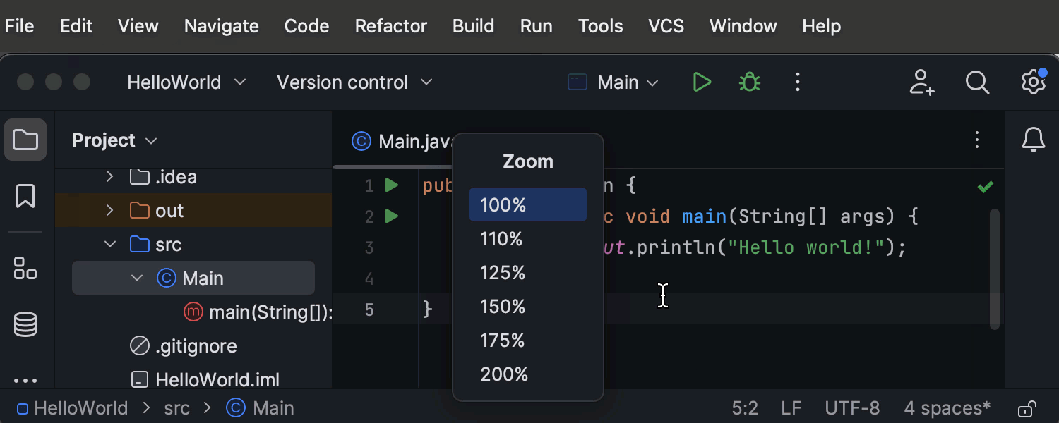 在 v2023.1 中,可以完全放大和缩小 IDE,同时增加或缩减所有 UI 元素的大小。 从主菜单中,选择 View | Appearance(视图 | 外观),调整 IDE 的缩放比例。 此外,您可以在 Settings/Preferences | Keymap | Main Menu | View | Appearance(设置/偏好设置 | 按键映射 | 主菜单 | 视图 | 外观)中指定调用这些操作的自定义快捷键。