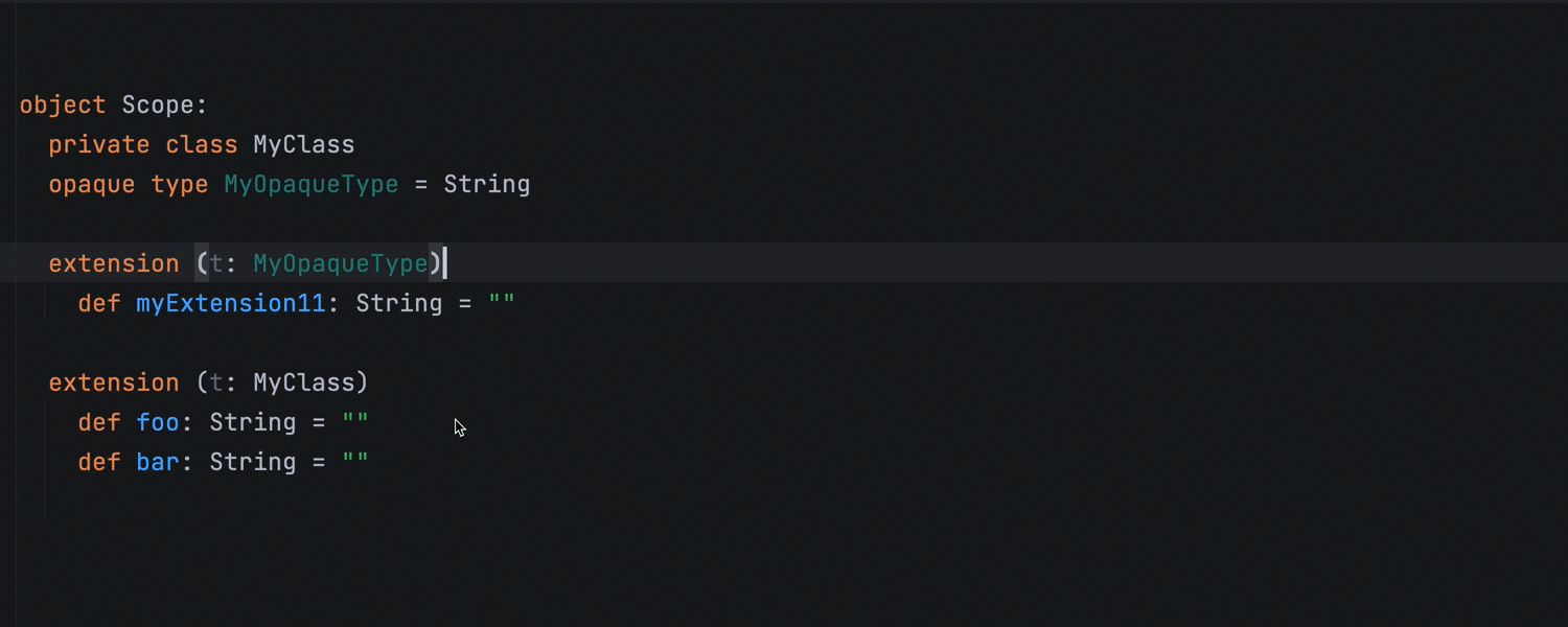 IntelliJ IDEA 现在可以正确对无大括号 Scala 代码脱糖,还可以处理使用“更少大括号”功能的重构。 它也支持工作表中的无大括号语法,并在代码中上下移动扩展方法时正确解释缩进。
