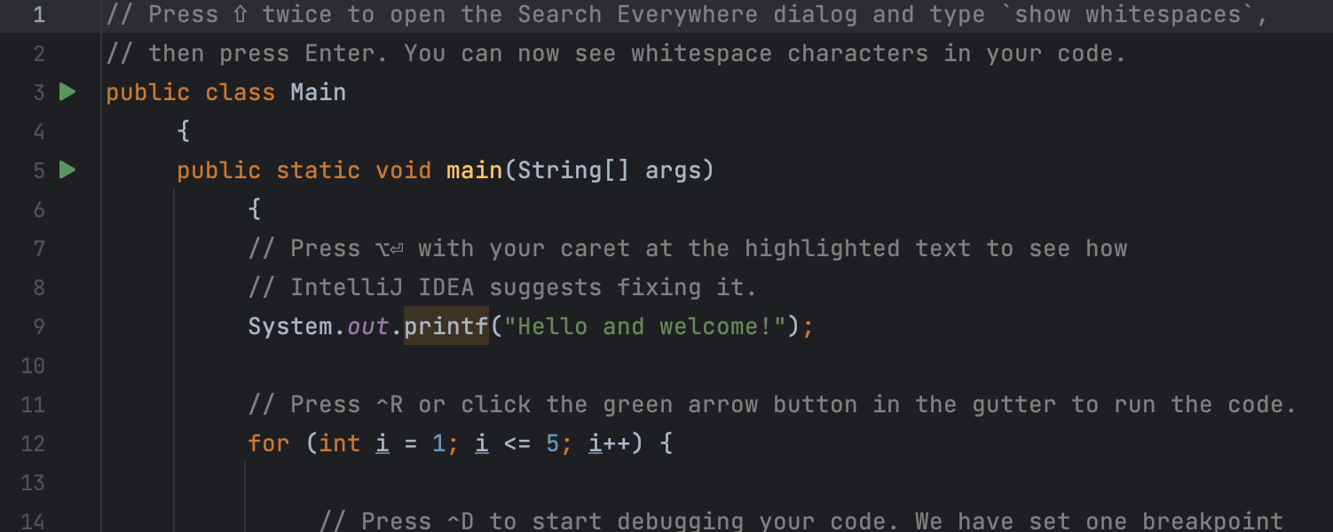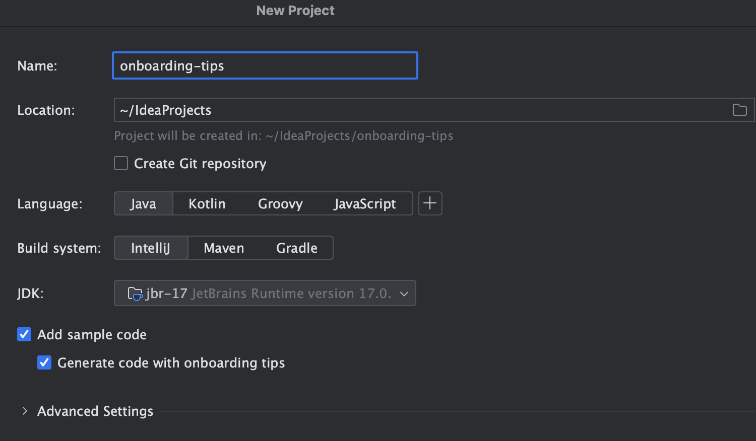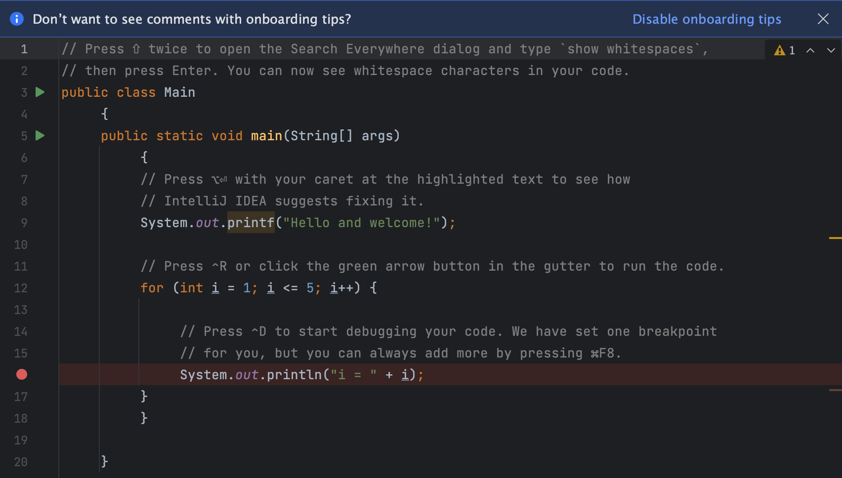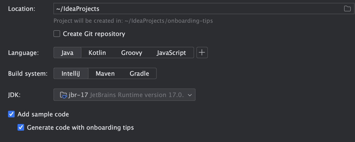对于刚接触 IntelliJ IDEA 和编码的用户,我们引入了打开包含示例代码与入门提示的新项目的选项。 在 New Project(新建项目)向导中,选中 Generate code with onboarding tips(使用入门提示生成代码)获得基本沙盒项目,其中包含演示 IDE 基本功能的提示。 遵循这个小指南,用户可以尝试 Search Everywhere(随处搜索)功能、应用快速修复、运行和调试代码,从而更快地熟悉 IDE。