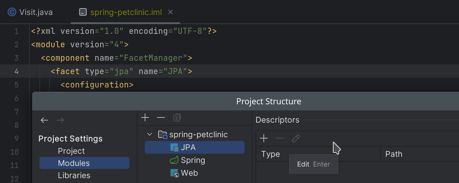 在 IntelliJ IDEA Ultimate 2023.1 中,您可以通过 File | Project Structure | Modules(文件 | 项目结构 | 模块)中的自定义 facet 更改和共享 Spring 和 JPA 设置。 例如,在团队中共享 JPA 的所选数据源时,您可以创建一个 JPA facet,并通过添加带有 *.iml 扩展名的模块文件的方式将其设置提交到版本控制系统。