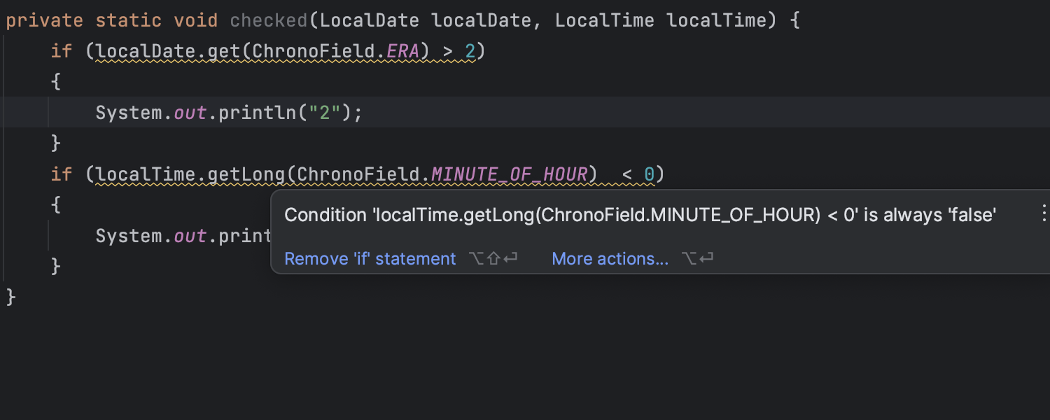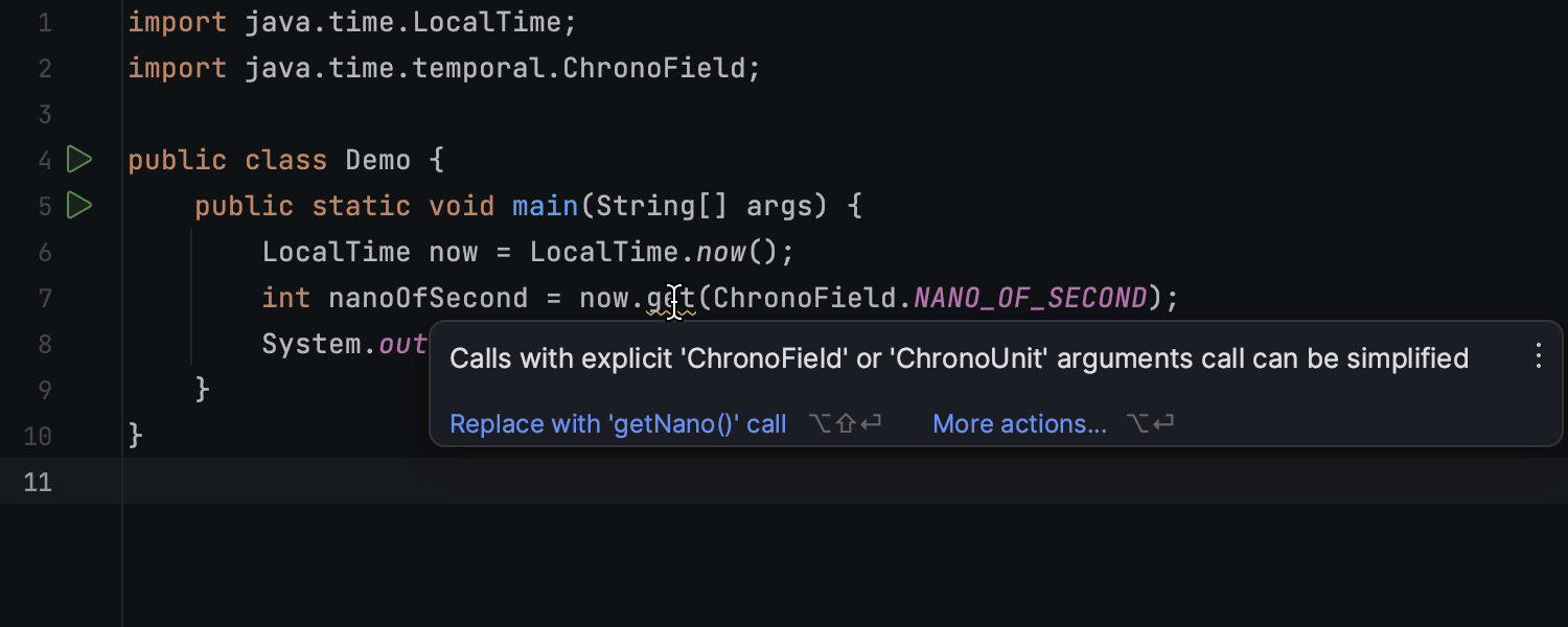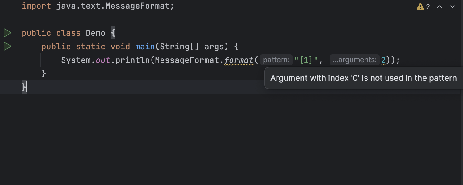我们改进并扩展了 Java 检查,帮助您维护优质代码并更有效地检测潜在问题。 当模式引用与实参不匹配时,新的 Incorrect ‘MessageFormat’ pattern('MessageFormat' 模式不正确)检查会发出警告,并且它还会检测 MessageFormat 模式中引号和大括号的错误用法。 此外,IDE 现在将报告带有显式 ChronoField 或 ChronoUnit 实参的调用,并建议将其替换为更具体的方法的调用,从而简化代码。 在这篇博文中详细了解 IntelliJ IDEA 2023.2 中的新检查和其他代码分析改进。