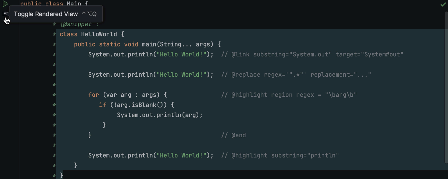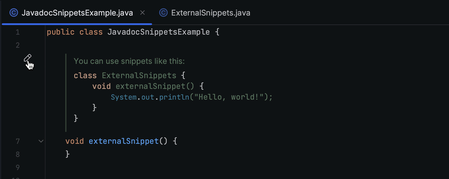 @snippet 标记的支持 IntelliJ IDEA 改进了 Javadoc 注释中的 @snippet 标记功能。 它允许在 @snippet 标记内添加标记注释,并在文档中正确呈现。 代码区域已得到支持,您可以指定要在 Javadoc 注释中引用的代码部分。 此外,IDE 现在还支持在 @snippet 标记内包含外部代码段,这将允许您引用存储在单独文件或源中的代码段,并将其包含在 Javadoc 文档中。