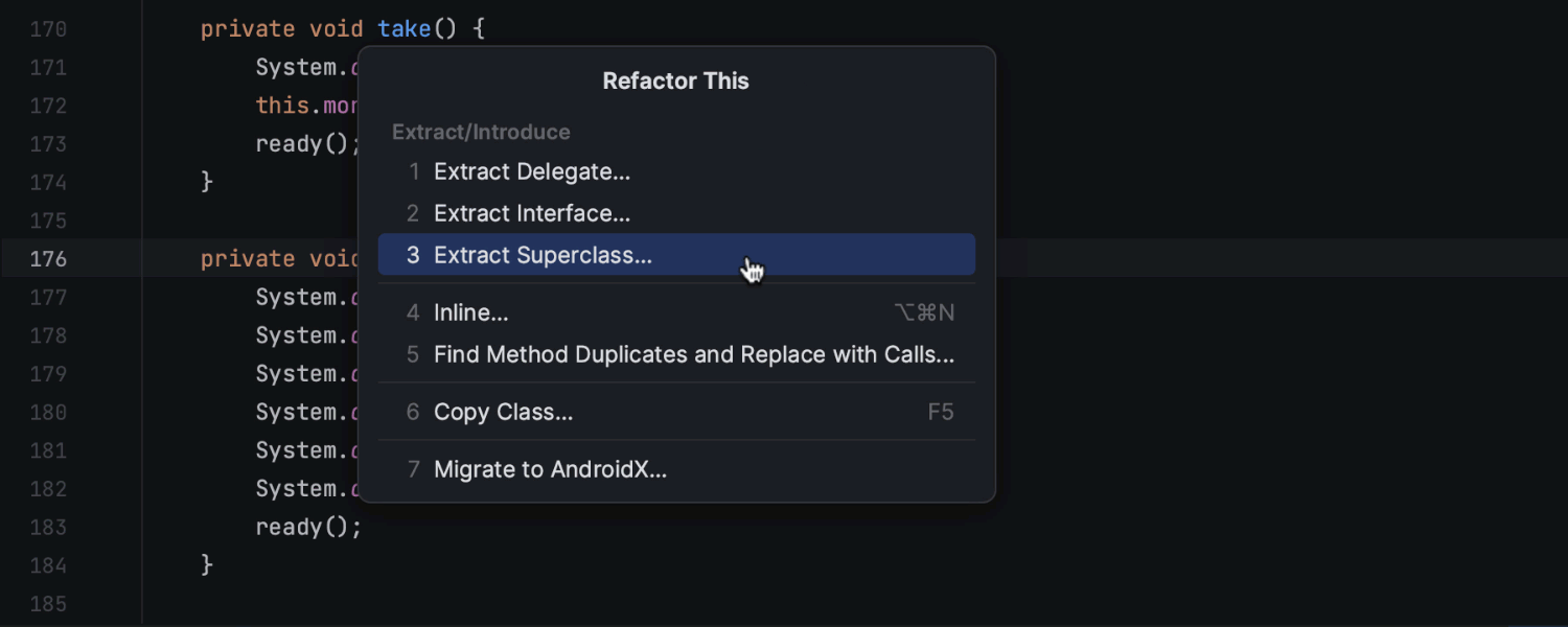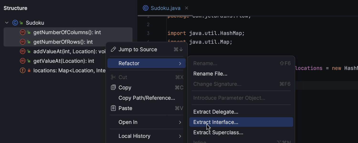 我们添加了新方式,可供同时将特定重构应用于多个成员。 现在,您可以在 Project(项目)或 Structure(结构)工具窗口中直接选择多个成员,同时对其调用 Extract Delegate(提取委托)、Extract Interface(提取接口)、Extract Superclass(提取超类)、Pull Members Up(向上拉取成员)和 Push Members Down(向下推送成员)。 此外,IntelliJ IDEA 现在支持以多文本光标选择进行扩展范围的重构,包括 Encapsulate Fields(封装字段)、Move Static Members(移动 static 成员)、Extract Delegate(提取委托)、Extract Interface(提取接口)和 Extract Superclass(提取超类)。 要利用此功能,请将文本光标放置在您希望应用重构的各成员中,IDE 将自动在重构对话框中预选并检查这些成员。