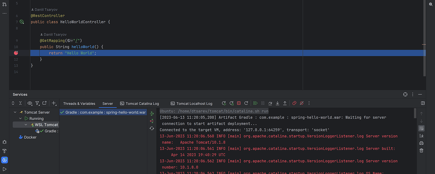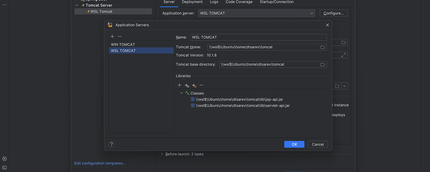 从 IntelliJ IDEA 2023.2 开始,您可以在适用于 Linux 的 Windows 子系统 (WSL) 上运行和调试部署到 Tomcat 的应用程序。 要在 WSL 上使用基于 Tomcat 的应用程序,您需要在 /etc/environment 或 ~/.bashrc 文件中声明 JAVA_HOME 环境变量。