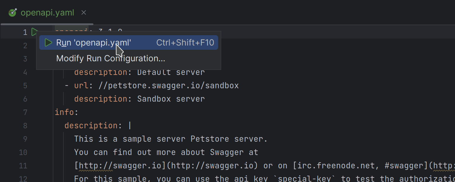 IntelliJ IDEA 现已支持 OpenAPI 和 Swagger 规范文件(包括 YAML 和 JSON 文件)的 Redoc UI 预览,允许您在 IDE 内的 Redoc 和 Swagger UI 之间切换。 通过 Redocly 集成,您可以从 IntelliJ IDEA 中访问 Try it 控制台,使用它设置参数并向 API 发送请求。