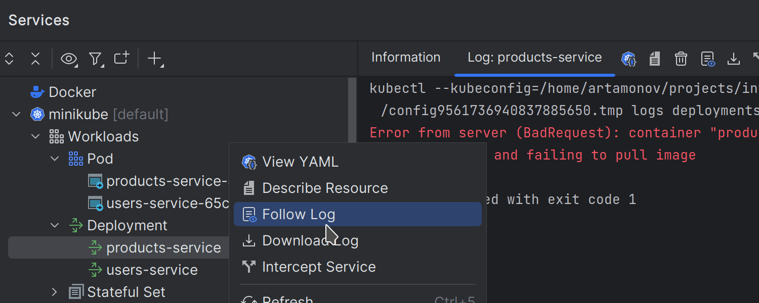 现在,您可以在 Services(服务)工具窗口中查看 Kubernetes 集群中的部署日志。 右键点击树中的 Deployment(部署),然后从上下文菜单中选择 Follow Log(关注日志)或 Download Log(下载日志)。