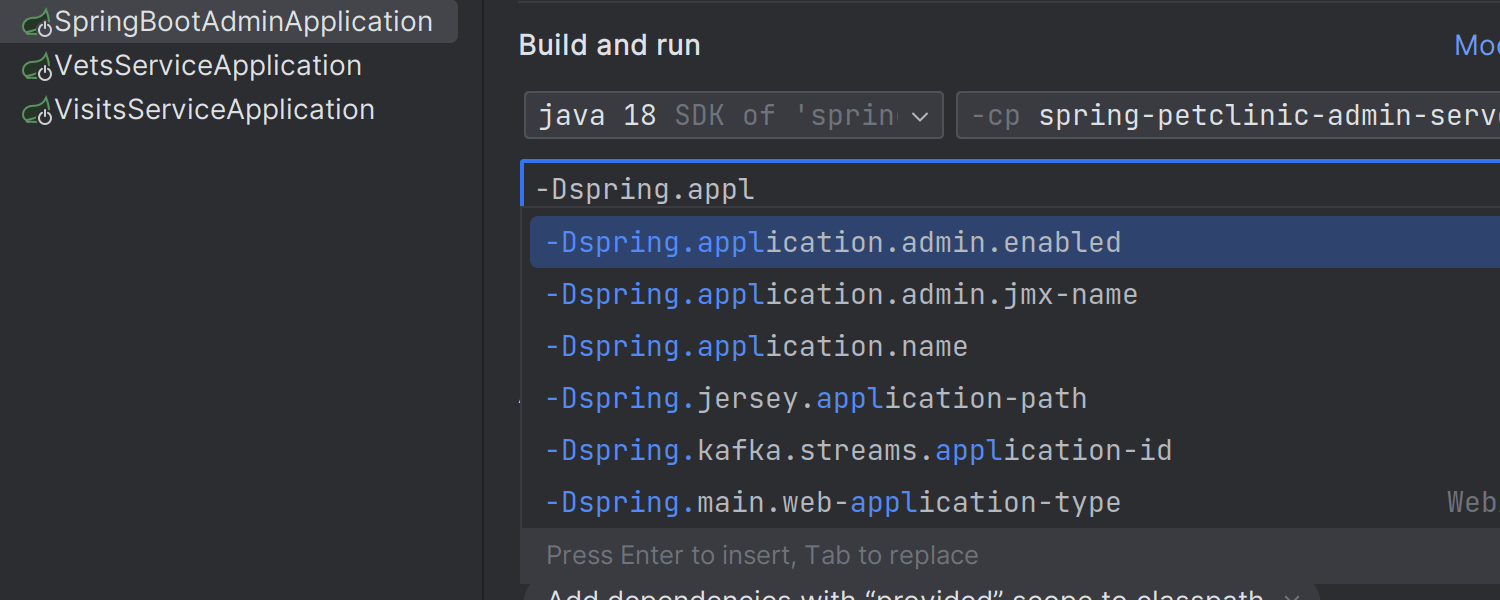 设置新的 Spring Boot 运行配置时,VM options(虚拟机选项)字段为 -D 标志后面出现的键提供自动补全选项。