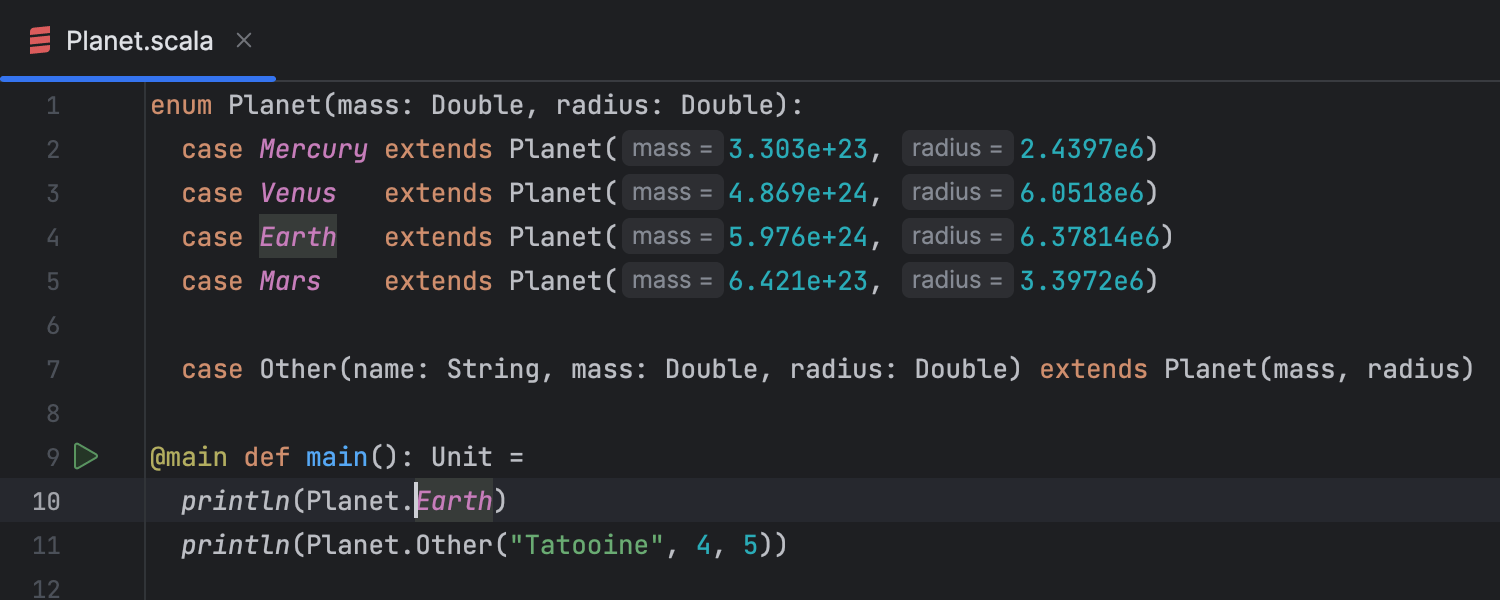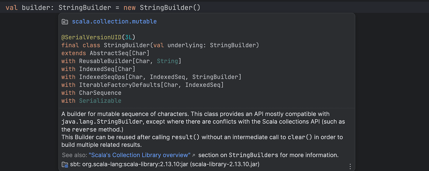 在这个版本中,ScalaDoc 的快速文档与 Javadoc 的更加一致。 现在,显示的声明中的注解、关键字和字面量将根据所选主题高亮显示。 如果超出可用空间,扩展的特征和类的列表将分成多行。 此外,文档中现在也支持 Scala 3 关键字。