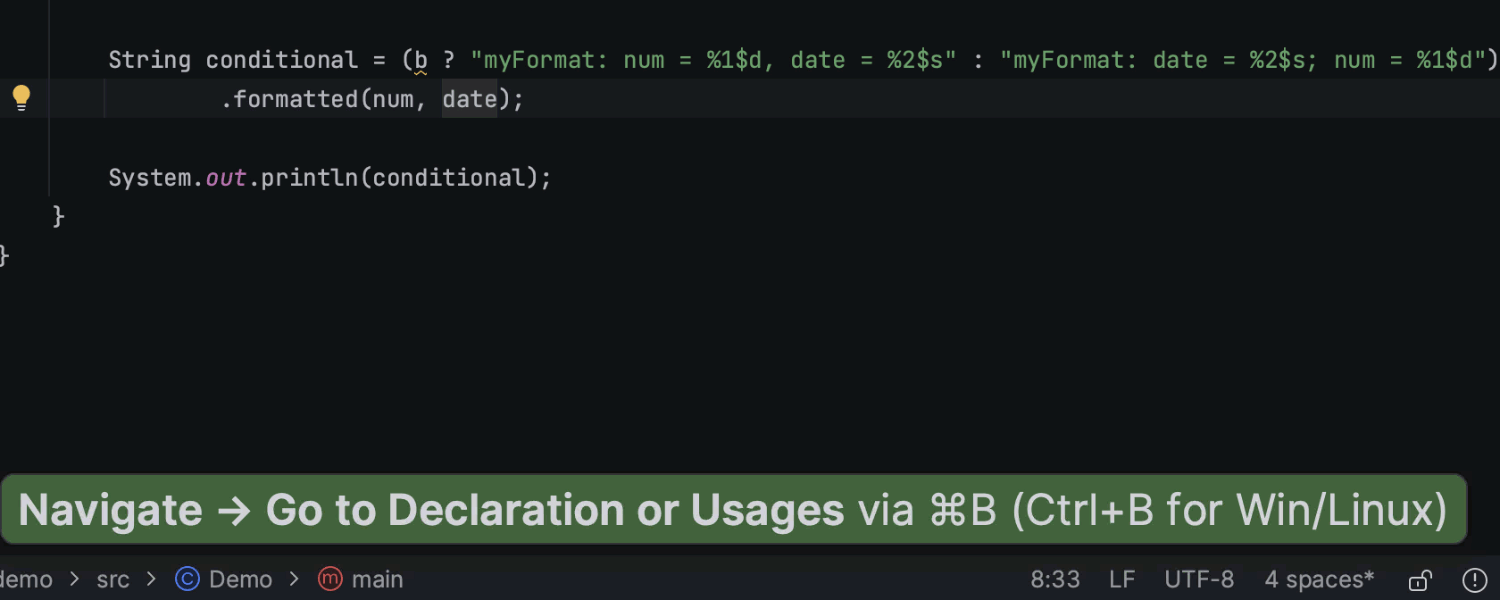 现在,将文本光标置于格式说明符上后,IDE 将高亮显示相应实参和指向它的其他说明符。 此外,您现在可以使用 Go To Declaration(转到声明)(Ctrl+B) 跳转到特定格式字符串占位符的关联代码位置。