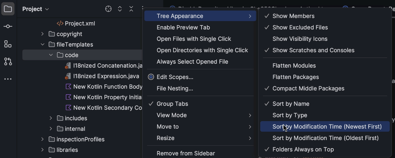 IntelliJ IDEA 2023.2 添加了备受期待的功能,让您可以根据修改时间在 Project(项目)视图中排列文件。 每当项目中有更改被保存时,这个新功能就会自动重排文件。 要启用此功能,首先打开 Project(项目)视图中的竖三点菜单,然后选择 Tree Appearance | Sort by Modification Time(树外观 | 按修改时间排序)。