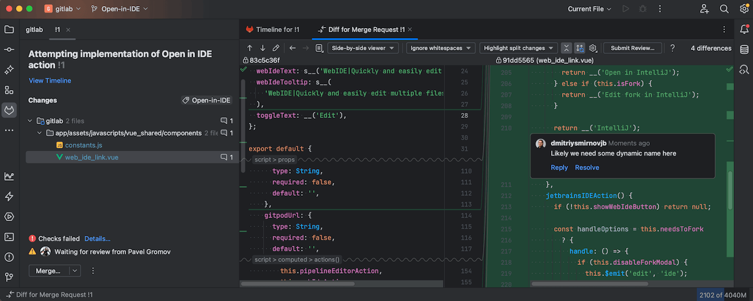 IntelliJ IDEA 2023.2 引入了与 GitLab 的集成,帮助简化您的开发工作流。 现在,您可以直接在 IDE 中使用 Merge Requests(合并请求)功能:查看请求列表、检查更改、留下评论,以及导航到相关视图。 了解详情。