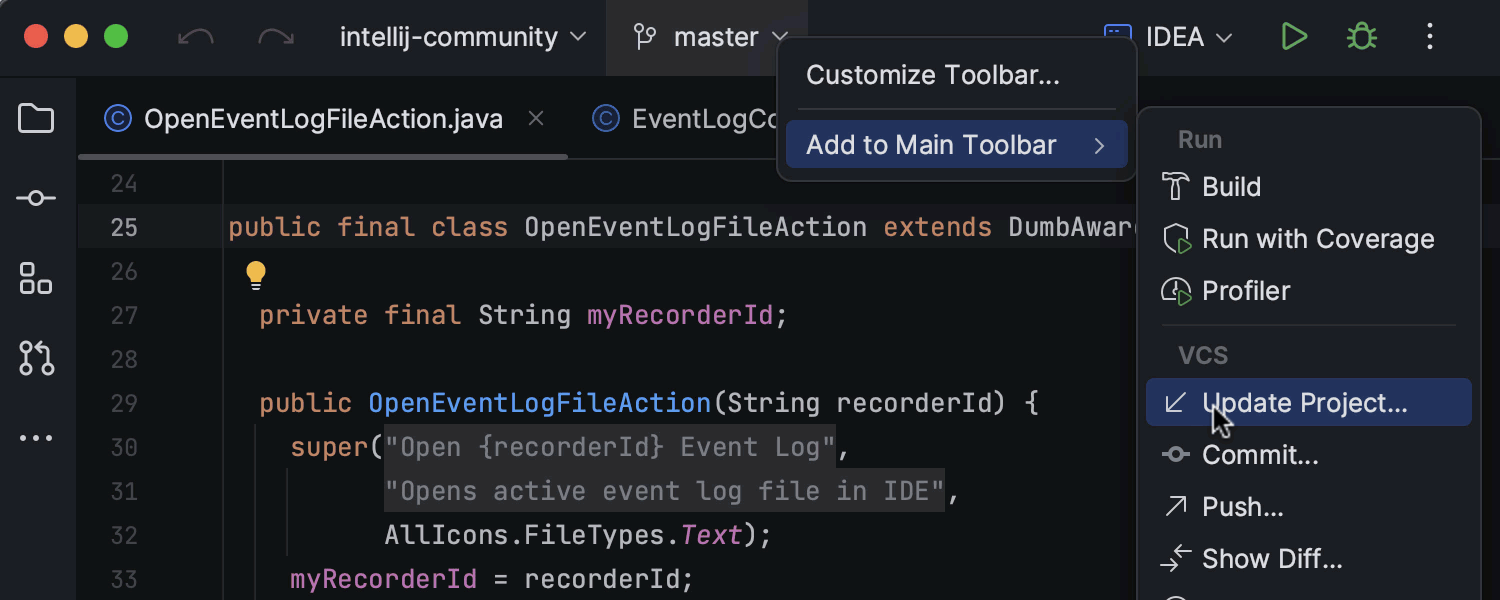 我们扩展了新 UI 主工具栏的自定义选项。 现在,您可以使用下拉菜单快速选择要添加到工具栏的操作。 右键点击任意微件,选择 Add to Main Toolbar(添加到主工具栏),然后浏览可用选项。