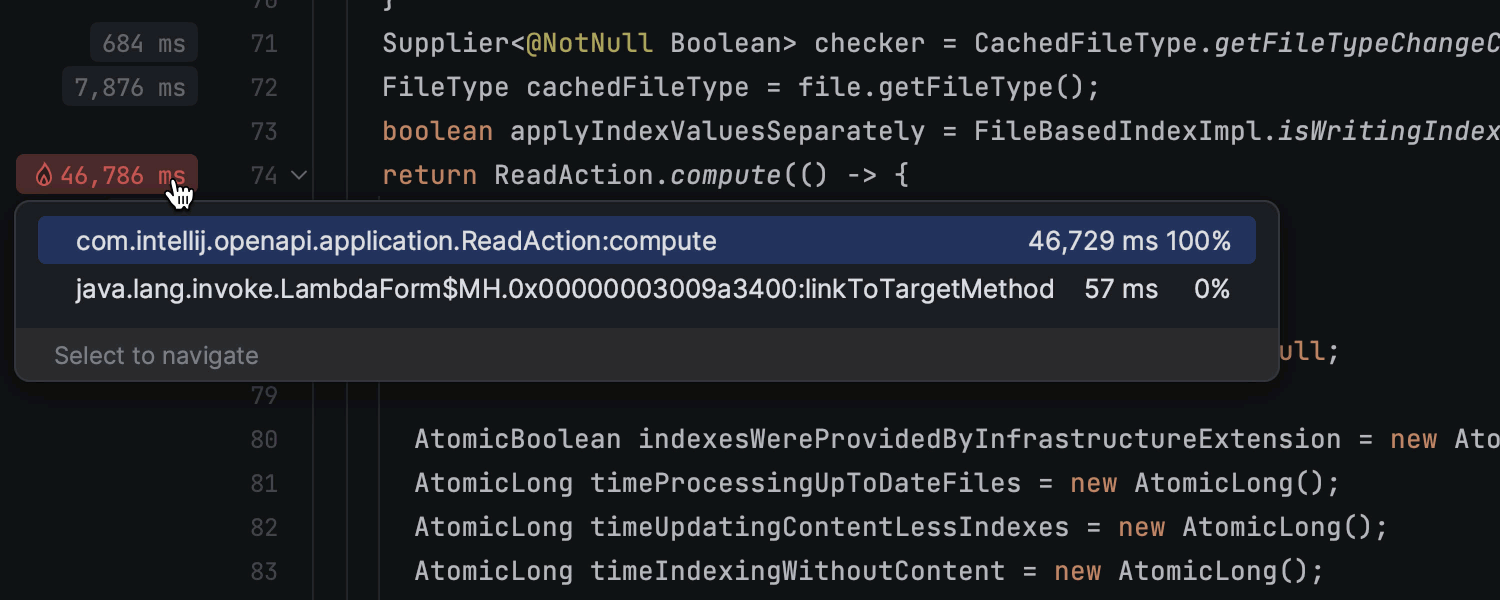 在 IntelliJ IDEA 2023.2 中,我们增强了 IntelliJ 分析器,为应用程序性能提供更有价值且易于理解的洞察。 新的编辑器内提示可供快速逐行分析代码性能,帮助您更快识别和解决问题。 编辑器装订区域中的颜色编码注解可以高亮显示关键方法,让您专注于性能瓶颈。 因此,您不再需要使用 Flame Graph(火焰图)和 Call Tree(调用树)视图执行彻底、耗时的分析。 在这篇博文中了解详情。