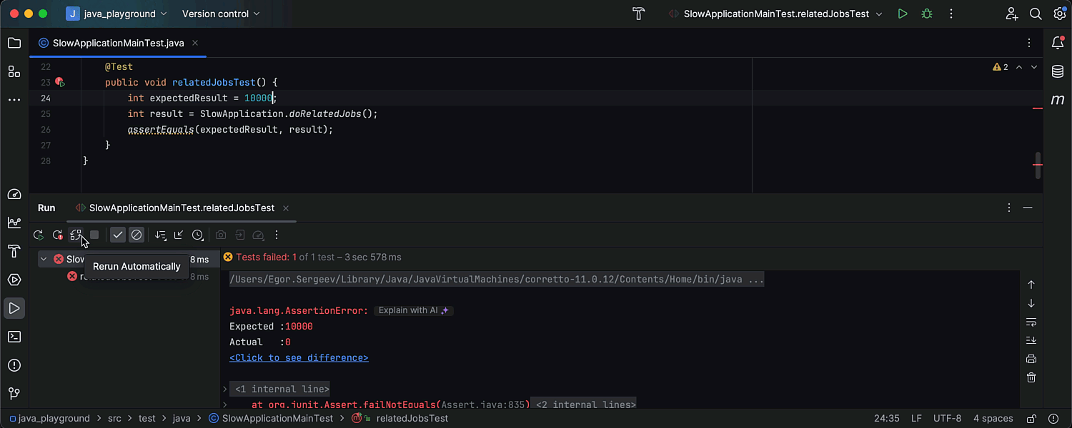 我们扩展了自动测试功能,使其与 Maven、Gradle 和 JPS 构建系统完全兼容。 我们还使持续测试模式更易激活。 要启用该模式,请使用 Run/Debug(运行/调试)工具窗口中新增的 Rerun Automatically(自动重新运行)按钮。 每当更改保存时,测试都会自动运行,对代码更新提供即时反馈。