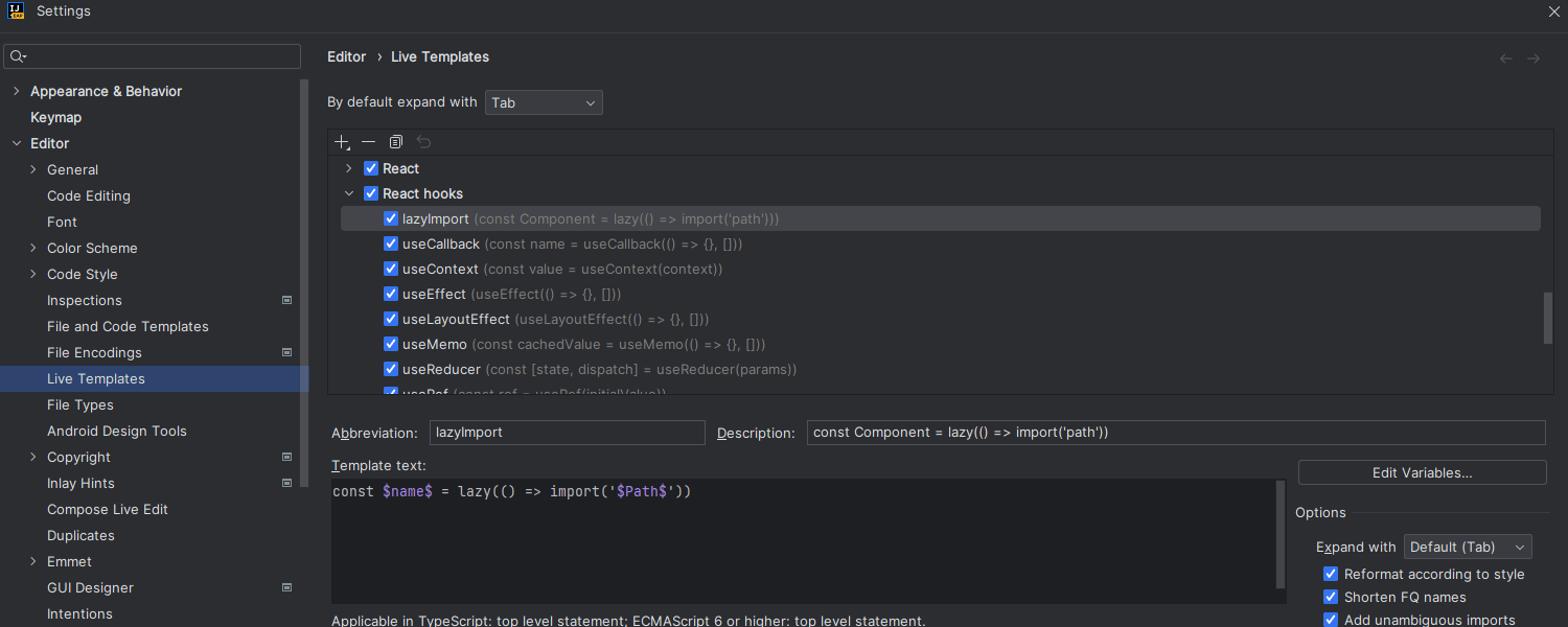 我们在 Settings | Editor | Live Templates | React hooks(设置 | 编辑器 | 实时模板 | React 挂钩)下为 React 挂钩添加了一组新的实时模板。 要使用实时模板,首先在编辑器中输入缩写,然后按 Tab 将其展开。