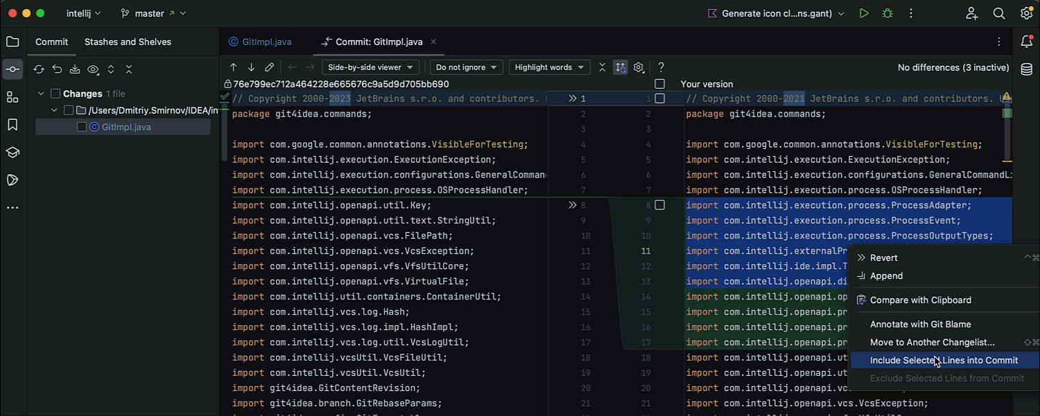 IntelliJ IDEA 2023.2 引入了一项备受期待的功能,可供有选择地提交代码区块的特定部分。 要执行部分提交,请选择区块中的行,然后从上下文菜单中调用 Include these lines into commit(将所选行包含到提交中)。 区块将被分为单独的行,所选行将被高亮显示。 您可以使用复选框或上下文菜单在选区中添加或排除行。