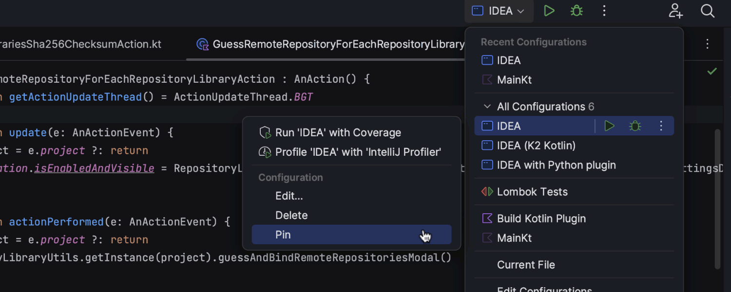 为了简化多个运行配置的管理,我们在 Run(运行)微件中实现了固定首选配置的选项。 要将运行配置添加到 Pinned(固定)部分,首先打开其名称旁边的竖三点菜单,然后选择 Pin(固定)。 如果有多个固定的配置,在列表中拖放即可轻松排列。