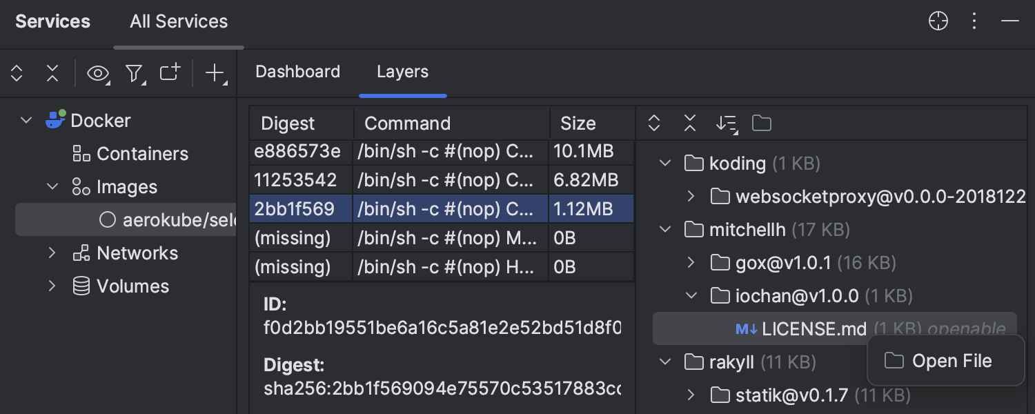 现在可以在 Services(服务)工具窗口中轻松访问和预览 Docker 镜像层的内容。 从列表选择镜像,选择 Show layers(显示层),然后点击 Analyze image for more information(分析镜像以获得更多信息)。 这将打开层中存储的文件列表,您可以右键点击文件,然后点击 Open File(打开文件)(对于二进制文件,则为 Download File(下载文件)),在编辑器中轻松打开所选文件。