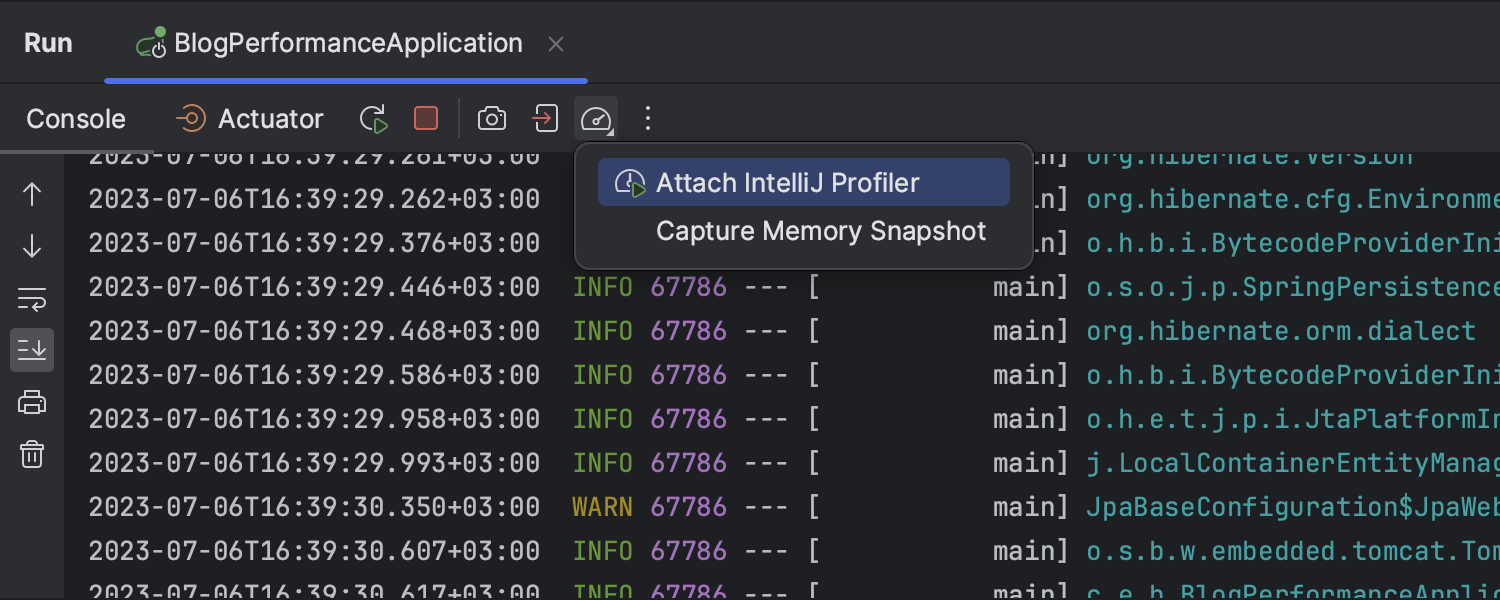 在 IntelliJ IDEA 2023.2 中,您可以直接从 Run(运行)工具窗口轻松访问 IntelliJ 分析器的功能。 使用新按钮,点击一下即可调用 Attach IntelliJ Profiler(附加 IntelliJ 分析器)和 Capture Memory Snapshot(捕获内存快照)操作,无需打开 Profiler(分析器)工具窗口或从头启动应用程序。