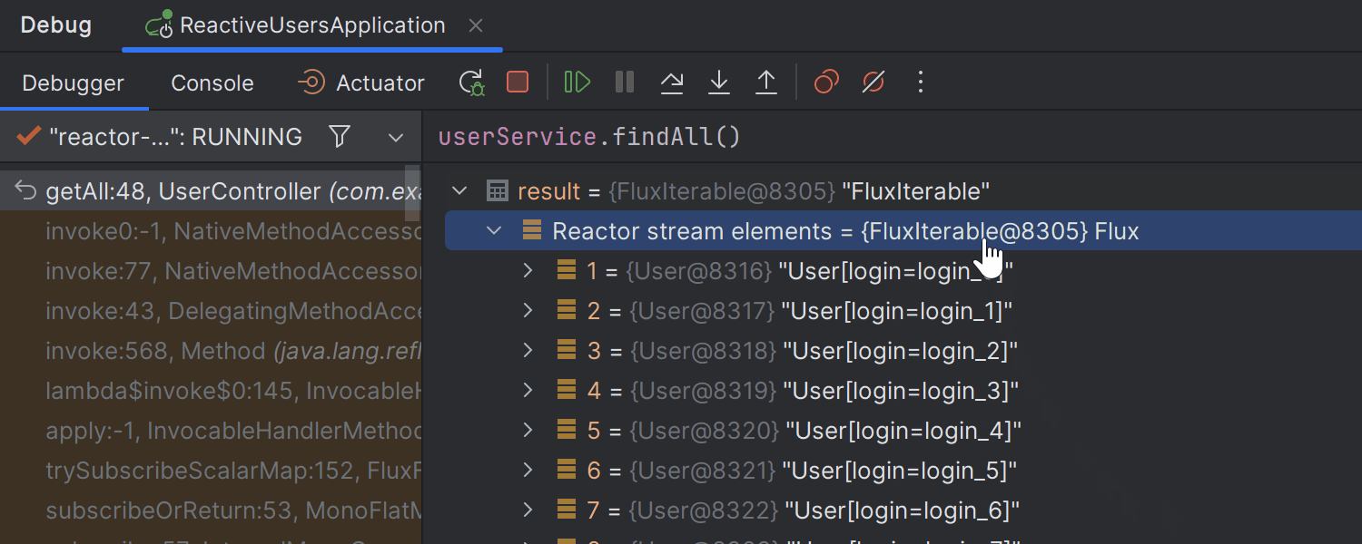 Mono 和 Flux 值求算 调试反应式应用程序时,您现在可以轻松求算 Mono 和 Flux 类型的监视和局部变量的值。 IDE 现在会在调试会话期间进行检测,并在 Variables(变量)视图中提供相应的 get 或 collectList 链接,点击即可立即计算 Reactive Streams 条目。 默认情况下,调试器会获取 Flux 的前 100 个条目。 您可以在 File | Settings | Languages & Frameworks | Reactive Streams(文件 | 设置 | 语言和框架 | Reactive Streams)中配置此数量。