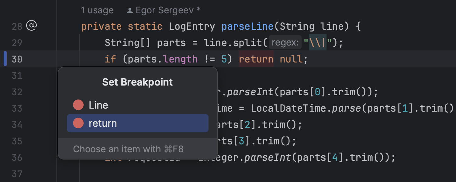 IntelliJ IDEA 提供了对直接在 return 语句处设置断点的改进支持,类似于已在 lambda 表达式中实现的设置方式。 这一改进将为开发者提供更高的调试精度和更深入的代码分析,带来更有价值的代码行为和返回值洞察。 要设置内联断点,只需右键点击语句旁边的装订区域并选择 return 选项即可。