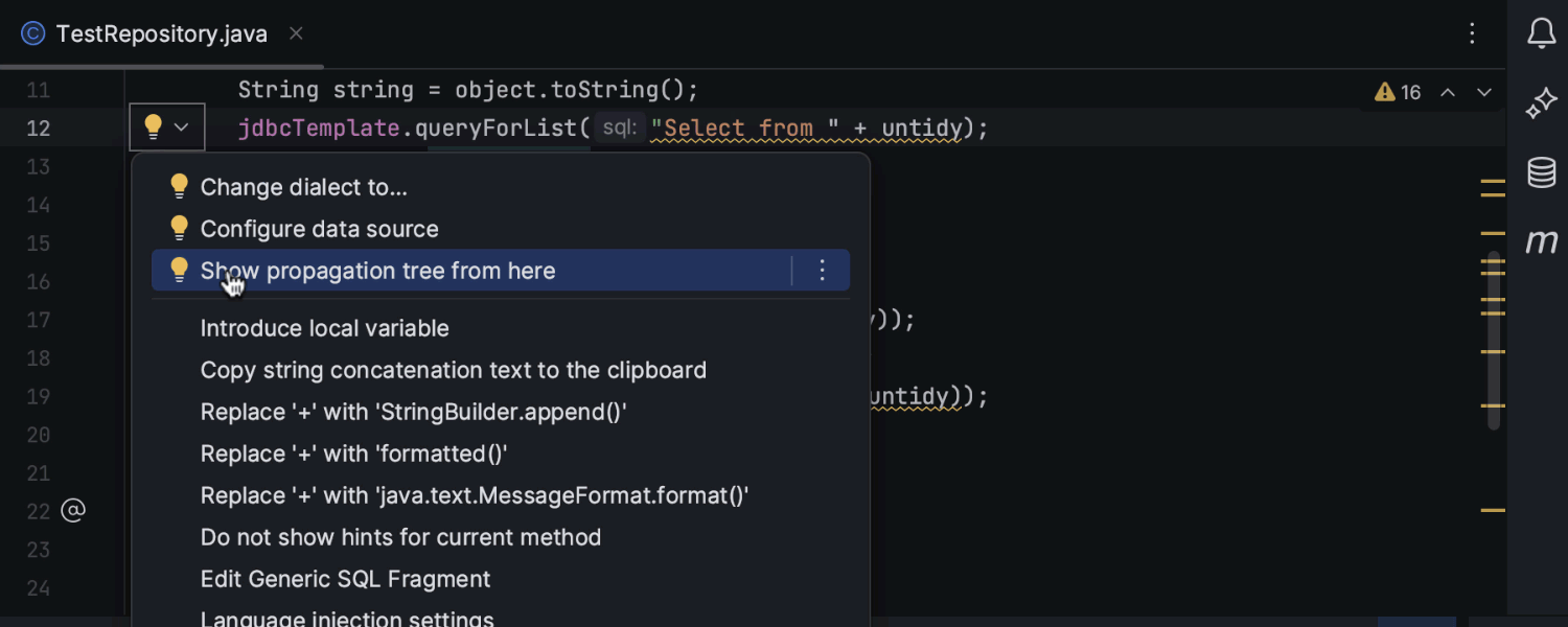 IntelliJ IDEA 现在可以更好地分析 Java 和 Kotlin 中 SQL 的串联和内插,检测潜在的不安全查询,使代码避免可能的 SQL 注入漏洞。
