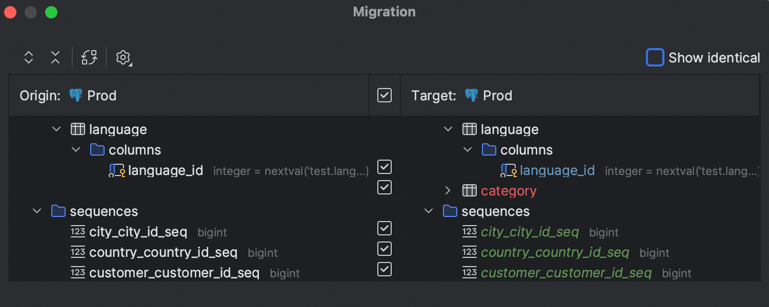 在 v2023.2 中,我们重做了架构迁移功能。 主要区别在于,同一个对象现在位于对话框两个部分的同一行上,从而更清晰地显示将在目标架构中添加、移除或更改的对象。