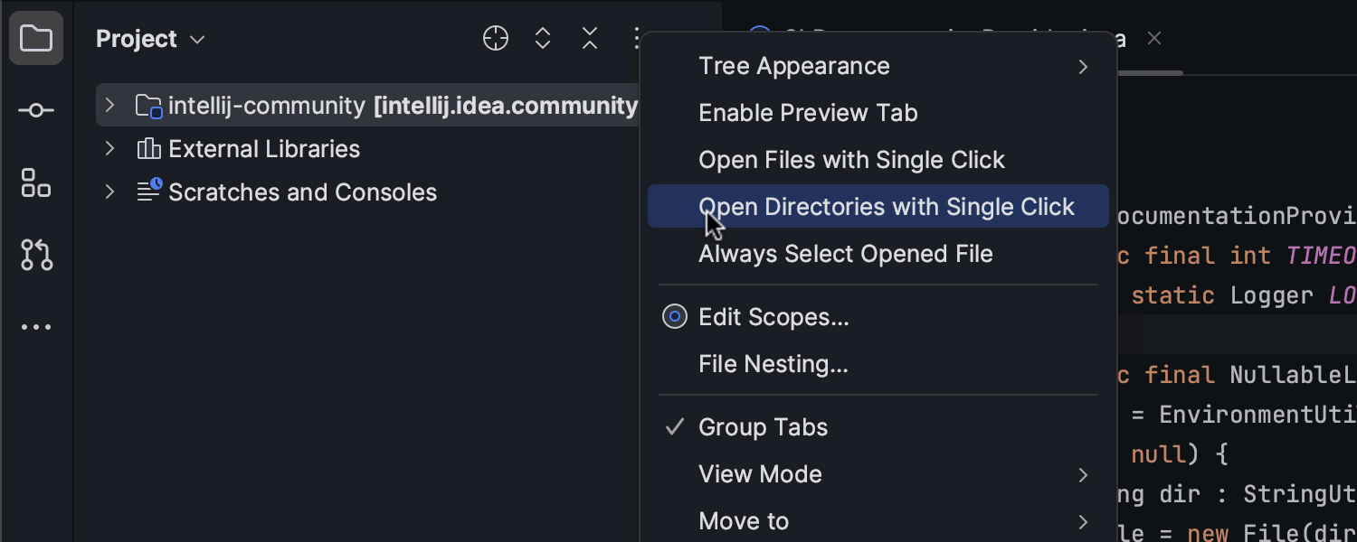 在 Project(项目)视图中,新增了 Open Directories with Single Click(单击打开目录)选项,可以更快展开和收起项目文件夹,更快响应。 点击竖三点菜单后,可以从下拉菜单中选择该选项。