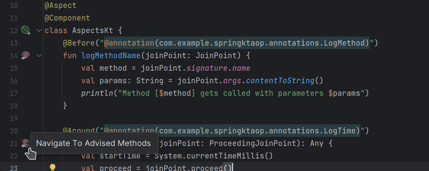 我们扩展了 IntelliJ IDEA 对在 Spring 应用程序中使用 AspectJ 的支持。 IDE 现在可为 Kotlin 代码提供分析和补全,此前已经为 Java 代码提供。