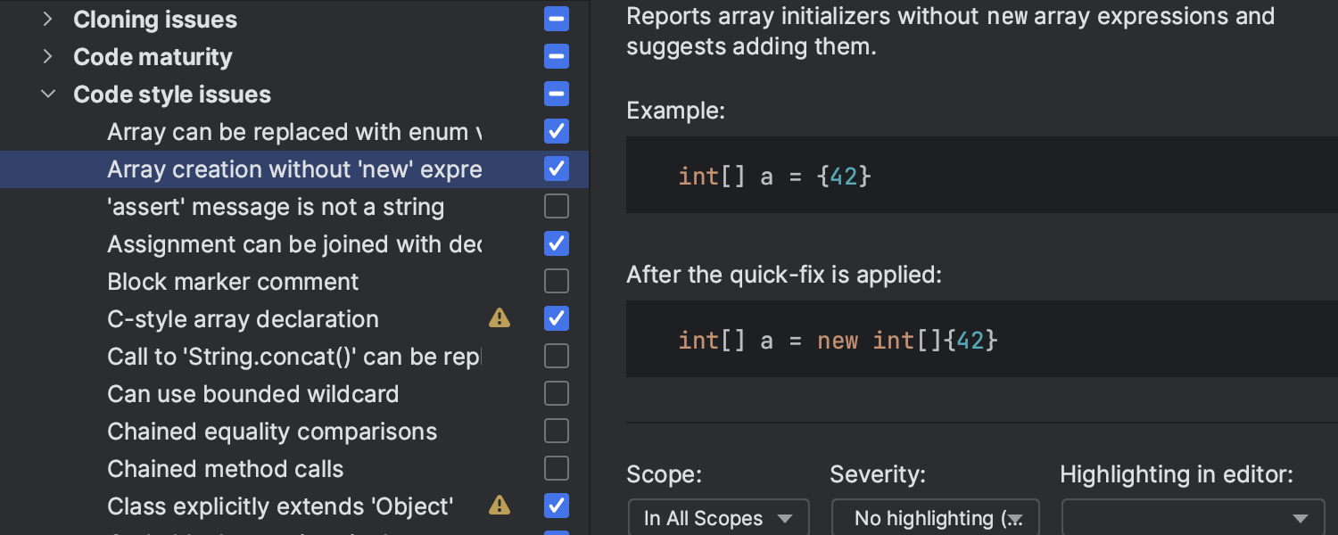 在 Settings / Preferences | Editor | Inspections(设置/偏好设置 | 编辑器 | 检查)中,代码示例现在将包含语法高亮显示,让您可以更容易理解是什么触发了检查并决定使其处于有效状态还是停用状态。