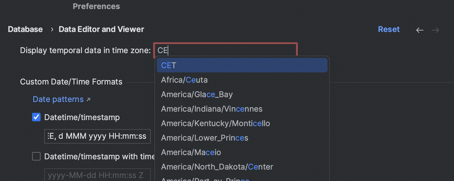 Data Editor and Viewer(数据编辑器和查看器)设置页面新增了 Time zone(时区)字段,用于设置显示 datetime 值的时区。