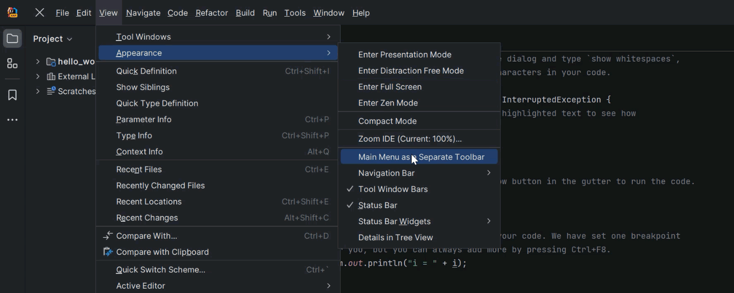 我们改进了 Windows 和 Linux 上新 UI 中主工具栏汉堡包菜单的行为。 点击菜单图标后,元素现在水平显示在工具栏上方。 此外,现在还有一个选项可以将此菜单转换为单独的工具栏,此选项的路径为 View | Appearance | Main menu as a Separate Toolbar(视图 | 外观 | 主菜单作为单独的工具栏)。