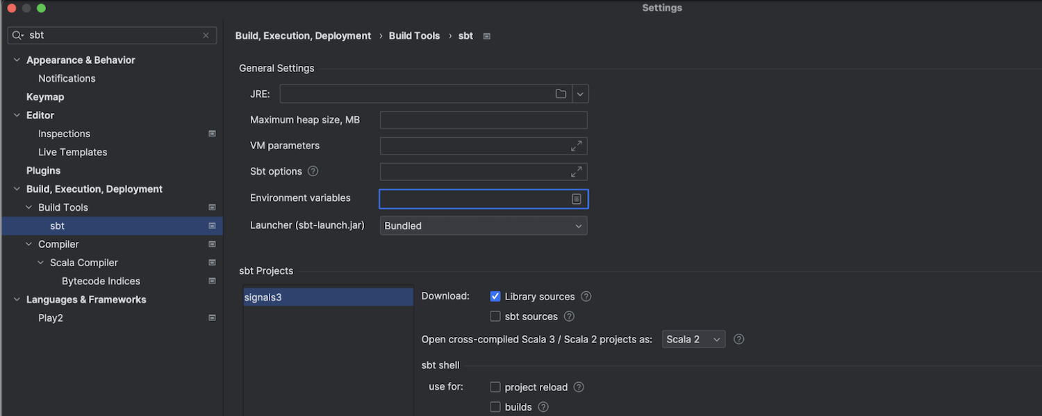 此版本对 IntelliJ IDEA 的 sbt 支持进行了许多改进。 重新打开项目后,为 sbt 设置的环境变量将被保留并正确处理。 重新设计的设置页面 File | Settings | Build, Execution, Deployment | Build Tools | sbt(文件 | 设置 | 构建、执行、部署 | 构建工具 | sbt)更为易用,并新增了 Environment variables(环境变量)字段,因此,您可以将自定义环境变量传递到 sbt-shell 进程。