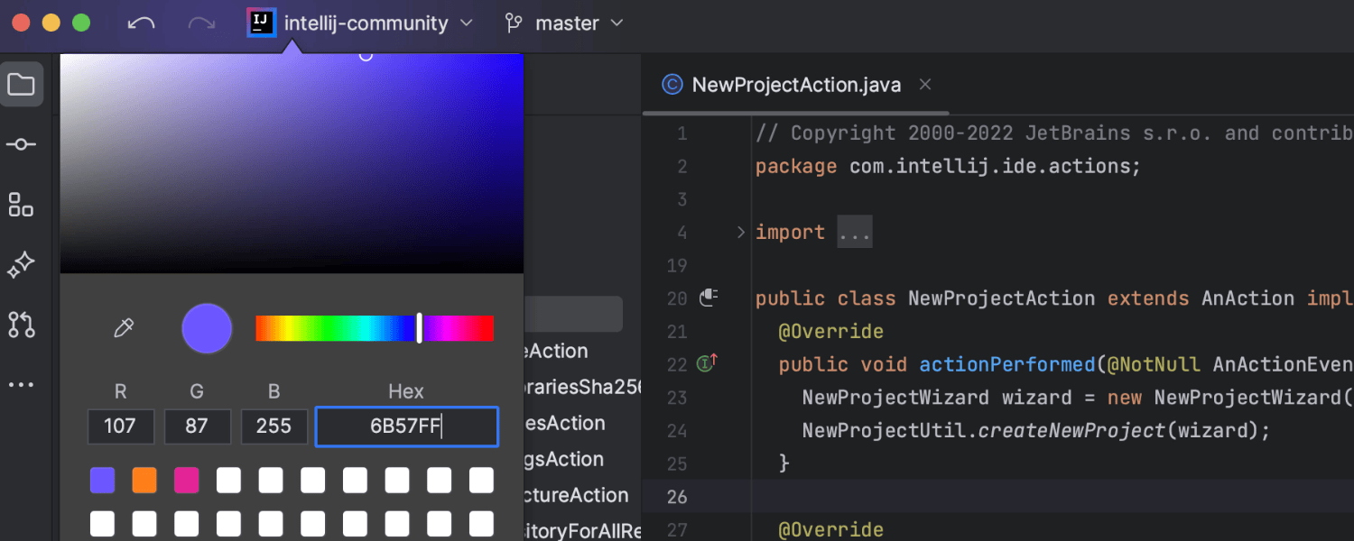 IntelliJ IDEA 2023.2 引入了彩色标题,可以简化多个打开的项目之间的导航。 现在,您可以为每个项目分配唯一的颜色和图标,使其在工作区中更易区分。 标题现在默认带有预定义的颜色,但您也可以自定义。 要为项目设置新的颜色,首先右键点击标题,然后访问上下文菜单。 然后,选择 Change Project Color(更改项目颜色)选项,并从建议的列表中选择所需颜色,或者浏览调色盘。 如果您想禁用此功能,只需在上下文菜单中取消选择 Show Project Gradient(显示项目渐变)选项。