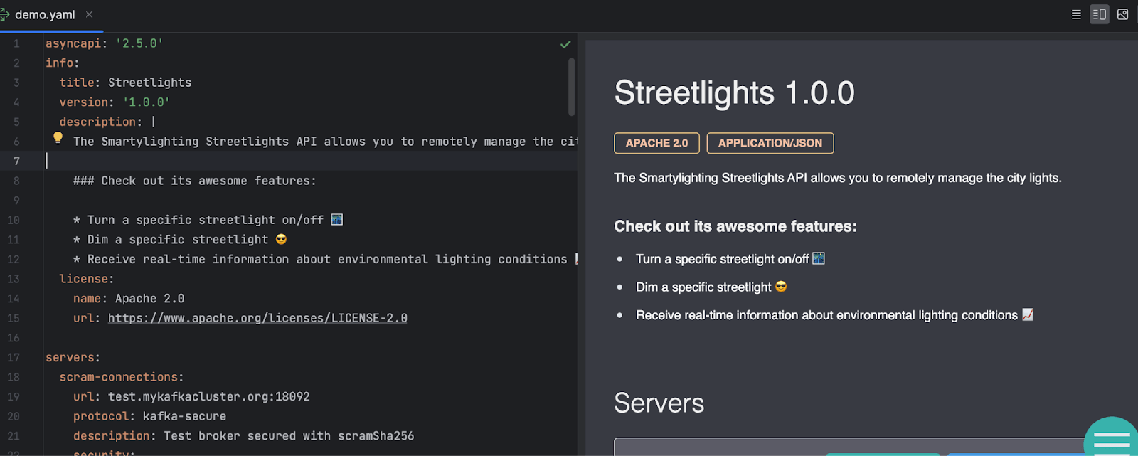 现在,在 IntelliJ IDEA 中使用 AsyncAPI 规范格式更加简单。 IDE 支持架构验证功能,并为引用、Endpoints(端点)视图和 Editor Preview(编辑器预览)窗格提供了代码补全。