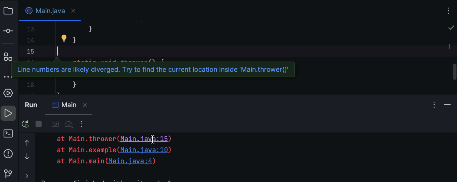为了改进堆栈跟踪分析并更快地解决 bug,IntelliJ IDEA 现在可以准确猜测报告中方法的位置,即使行号不可用或已偏离。