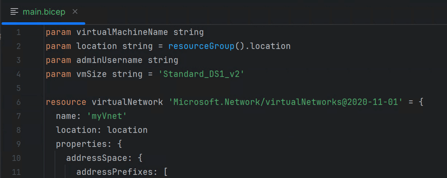 我们引入了对 Bicep 的初步支持,这是专为 Azure 定制的基础架构即代码语言。 它可以转换为 Azure Resource Manager (ARM) 模板,旨在与 Azure 服务紧密集成。 IDE 现在提供代码高亮显示以及通过 Bicep 的语言服务器协议实现的代码补全。