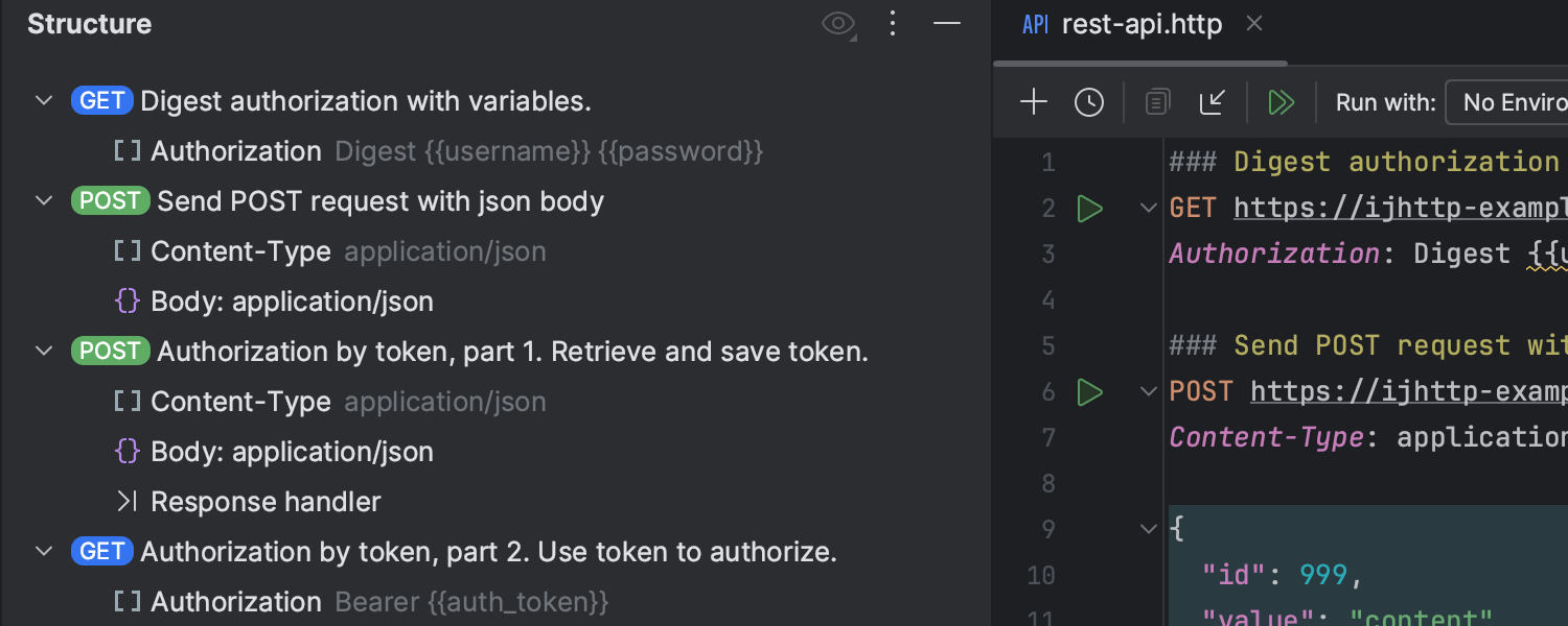 我们改进了 HTTP 客户端中的 Structure(结构)工具窗口,以简化大型 .http 文件中的导航。 此更新为请求类型引入了颜色编码标签,可以更清晰地列出内容。