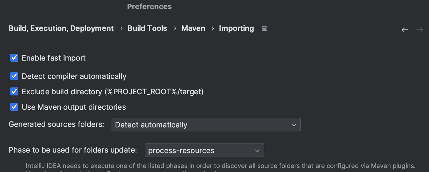 我们为所有项目启用了新的快速 Maven 项目导入机制,包括使用旧导入实现创建的项目。 这将显著缩短导入时间。 当您第一次在 2023.3 版本中打开项目时,IDE 将执行完全重新同步并通知您有关迁移的信息。 您可以在 Settings/Preferences | Build, Execution, Deployment | Build Tools | Maven | Importing(设置/偏好设置 | 构建、执行、部署 | 构建工具 | Maven | 导入)中调整此设置。