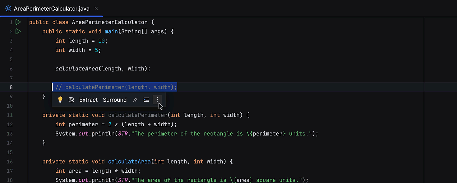 IntelliJ IDEA 2023.3 引入了一个浮动工具栏,该工具栏会在所选代码段旁边显示,提供对 Extract(提取)、Surround(包围)、Reformat(重新格式化)和 Comment(注释)等编辑操作以及上下文操作的轻松访问。 您可以使用竖三点菜单自定义浮动工具栏。 要将其隐藏,您可以使用相同的菜单或转到 Settings/Preferences | Advanced Settings | Editor(设置/偏好设置 | 高级设置 | 编辑器),选中 Hide floating toolbar for code editing(隐藏代码编辑的浮动工具栏)选项。