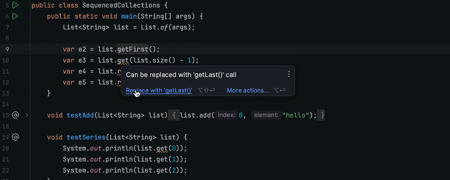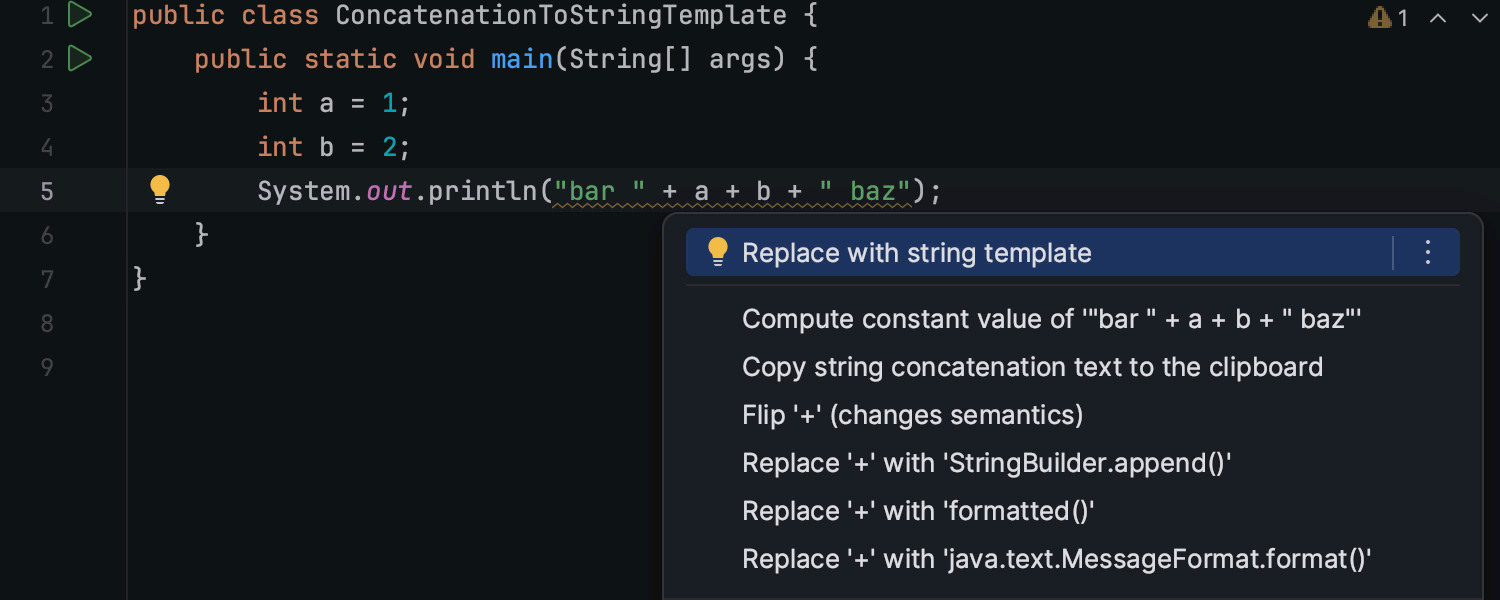 随着 Java 21 中字符串模板的发布,我们实现了一项新的检查来简化串联字符串的替换。 IDE 现在将提供快速修复建议,用 STR 模板处理器替换串联。