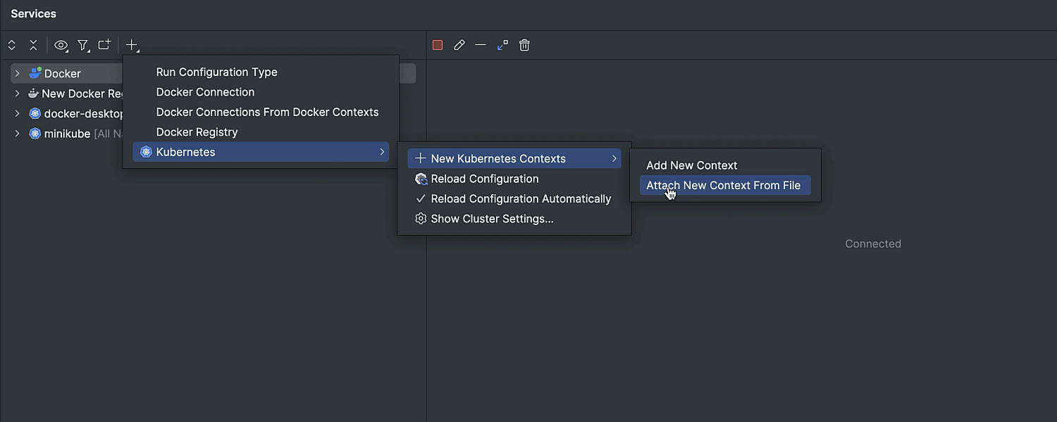 借助 IntelliJ IDEA Ultimate 2023.3,您可以从位于所需系统外的目录中的集群轻松添加 kubeconfig 上下文。 项目将包含指向 kubeconfig 文件的链接,使这些集群在您处理项目时可用。 以这种方式添加的 kubeconfig 内容不会被复制到系统 (~/.kube/config) 中,也不会被修改。 频繁从云或本地部署环境添加和移除 Kubernetes 集群时,此功能特别实用。 了解详情。