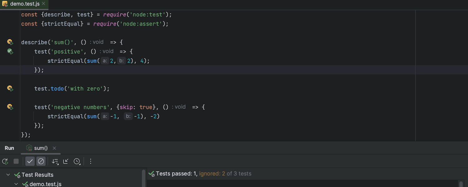 IntelliJ IDEA Ultimate 2023.3 为测试 JavaScript 代码带来了新功能。 Cypress 和 Playwright 测试现在可以自动检测,并且可以从编辑器中的 Run(运行)图标运行。 我们还引入了对原生 Node.js 测试运行程序的初步支持。 通过 node:test API 声明的测试现在可被识别,这样一来,可以直接从代码运行和调试,无需额外软件包。